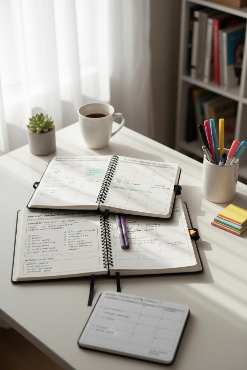 Next, break the plan into projects and tasks. In your project management notebook, give each campaign its own page with goals, target audience, channels, budget notes, and a checklist that moves from brainstorm to publish. Color-code by channel or objective, and assign owners and due dates if you have a team—if it’s just you, batch tasks by day so you’re not context-switching. Think: refresh website hero, write three emails, schedule reels, pitch two partners, track results. Keep a running list of metrics to review weekly so you can quickly spot what’s working and nudge what isn’t. Pair this with a productivity planner for your daily top three priorities; time-block an hour for content, an hour for outreach, and a quick 15-minute metric check. Tuck everything into a simple desk organizer so your pens, sticky flags, and highlighters are right where you need them when a fresh idea pops up.