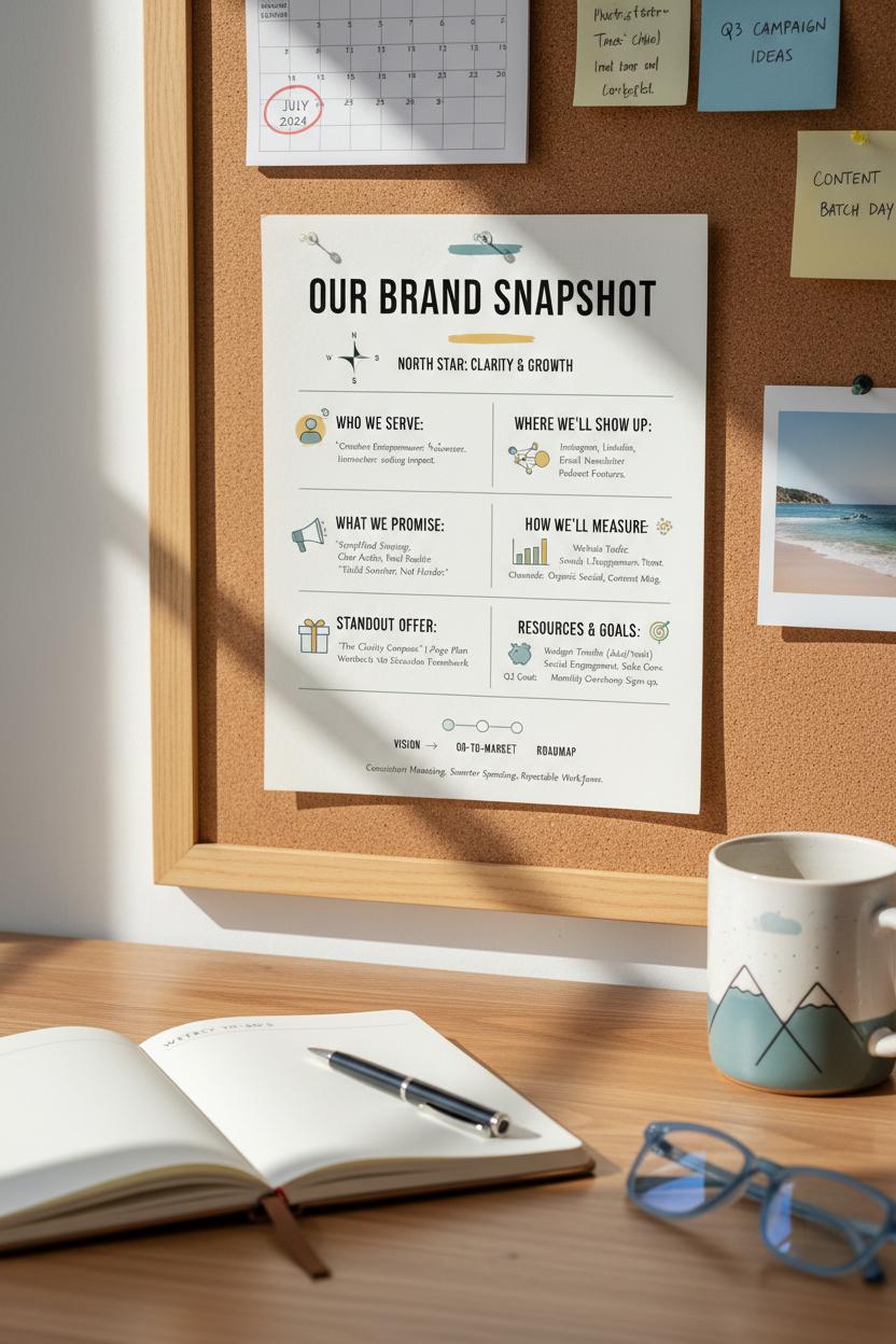 Next, get wonderfully specific about your Audience. Imagine one person standing in front of you—give them a name, a routine, a pain point, a dream. What do they type into Google at midnight? What do they save to their boards? The clearer you are here, the easier it is to craft your Offer: the promise your product or service makes. Outline your signature offer and any supporting add-ons, and write the exact transformation it delivers. Keep it concise and outcome-focused. This core trio—Vision, Audience, Offer—forms the heart of your go-to-market plan for new launches and the backbone of your ongoing marketing roadmap.