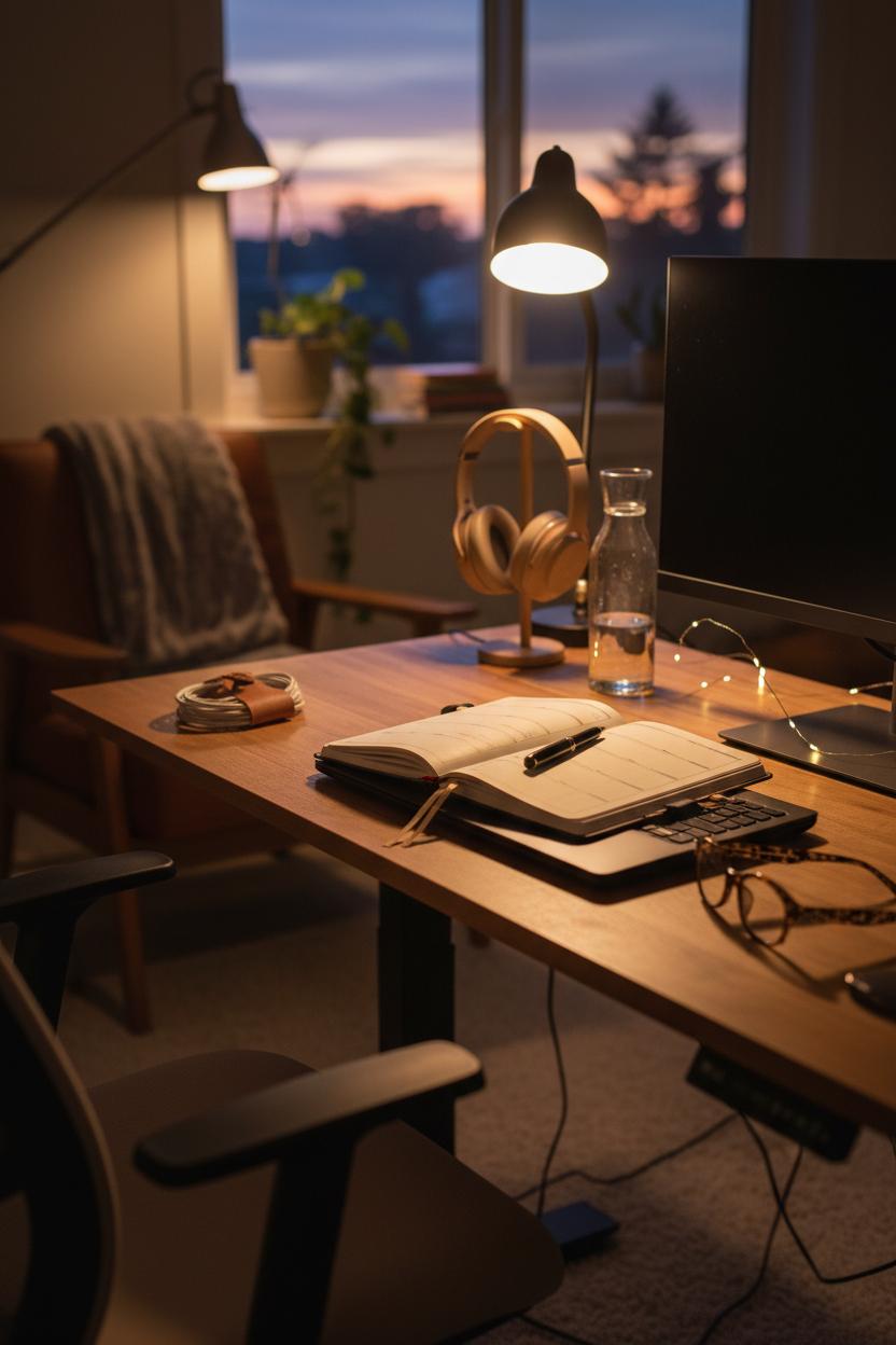Think of these upgrades as embodied productivity tips. Use your desk’s movement as a ritual: stand for brainstorming, sit for editing, and switch positions every 45–60 minutes to keep momentum humming. Keep an undated planner open at your elbow for fast capture—ideas, to-dos, time blocks—and protect your concentration with noise cancelling headphones that signal “I’m in flow.” If you’re on screens late, slip on blue light glasses to ease eye fatigue and protect your sleep window. These are simple tools, but they stack: better ergonomics, calmer surroundings, clearer focus, and kinder time management. Even a five-minute reset between calls—lift the desk, stretch, refill your water—can reset your pace for the afternoon. Over time, this thoughtful setup becomes a quiet partner in your success, a place that holds you accountable to your goals and gently supports the rhythms of a sustainable business lifestyle. Make it lovely, make it ergonomic, and make it yours—the small comforts you build today will carry big results into every client call, launch, and creative sprint.