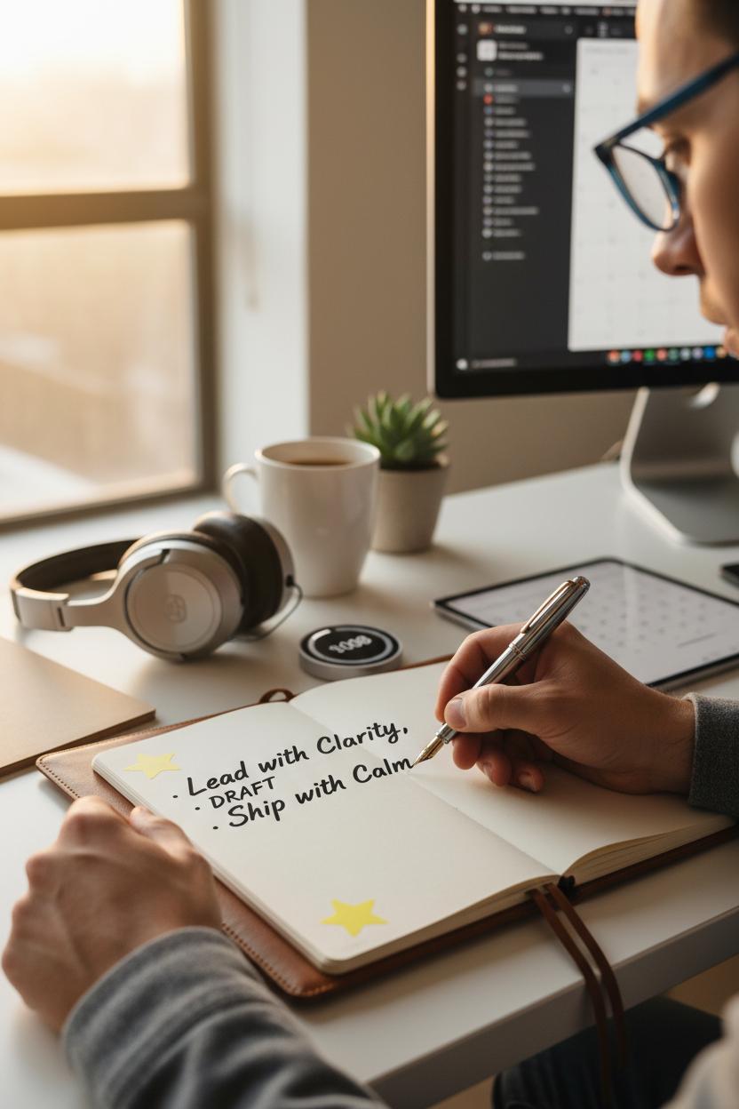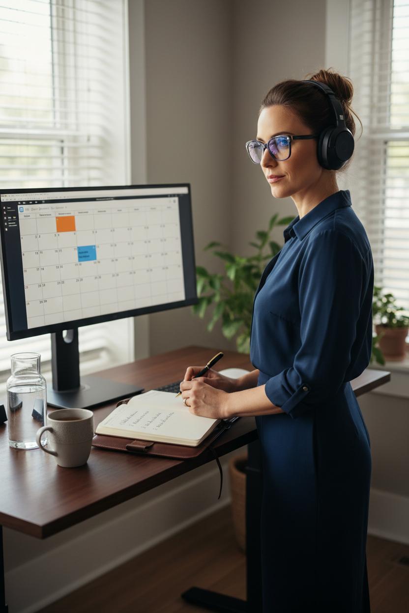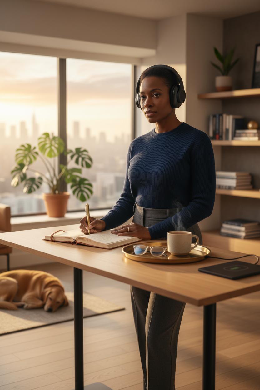 Here’s how it looks when it really works. I stand at my standing desk, headphones on, spine long, and crack open a leather notebook with a favorite luxury pen. Ten quiet minutes: three crystal intentions, one courageous action, one boundary to hold. Productivity tips love a framework, but the point is focus—trimming mental clutter so leadership habits can surface. Then I slide to screens for a swift data pass, blue light glasses on if the glow is harsh, and scan pre-reads or draft talking points while the world is still gentle. Another five-minute check: what can be delegated, what needs my voice, what can wait. The headphones create a social cue too—family, roommates, even pets learn that “cans on” equals sacred prep; the house keeps moving, but you’re in the cockpit. When you lift them, you rejoin the noise with a steadier compass.