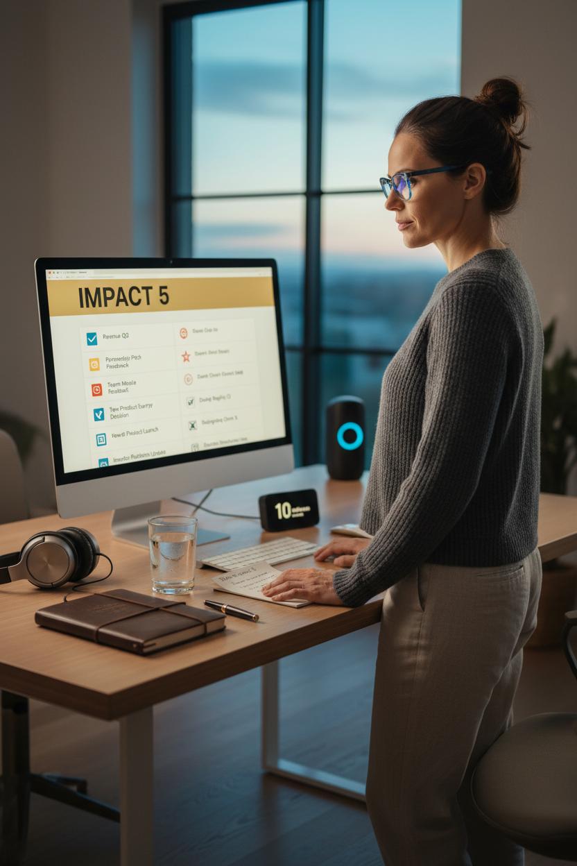 Now take those five and sort them into action. Two are for quick momentum—90-second replies that unblock someone or confirm a direction. One is for delegation—forward with clarity, context, and a deadline that supports their success. One is a relationship touchpoint—invest 2–3 thoughtful lines that nurture trust. And the last one is your deep work seed—don’t answer it now; schedule a 25–45 minute block later. Stand up at your standing desk, put on noise cancelling headphones, and send the quick replies first so you feel the shift from reactive to proactive. Then, with your leather notebook and a luxury pen, write a simple micro-plan: “Today’s Impact 5,” the single deep-work window, and one leadership habit you’ll practice (clear feedback, decisive yes/no, or a check-in with a direct report).