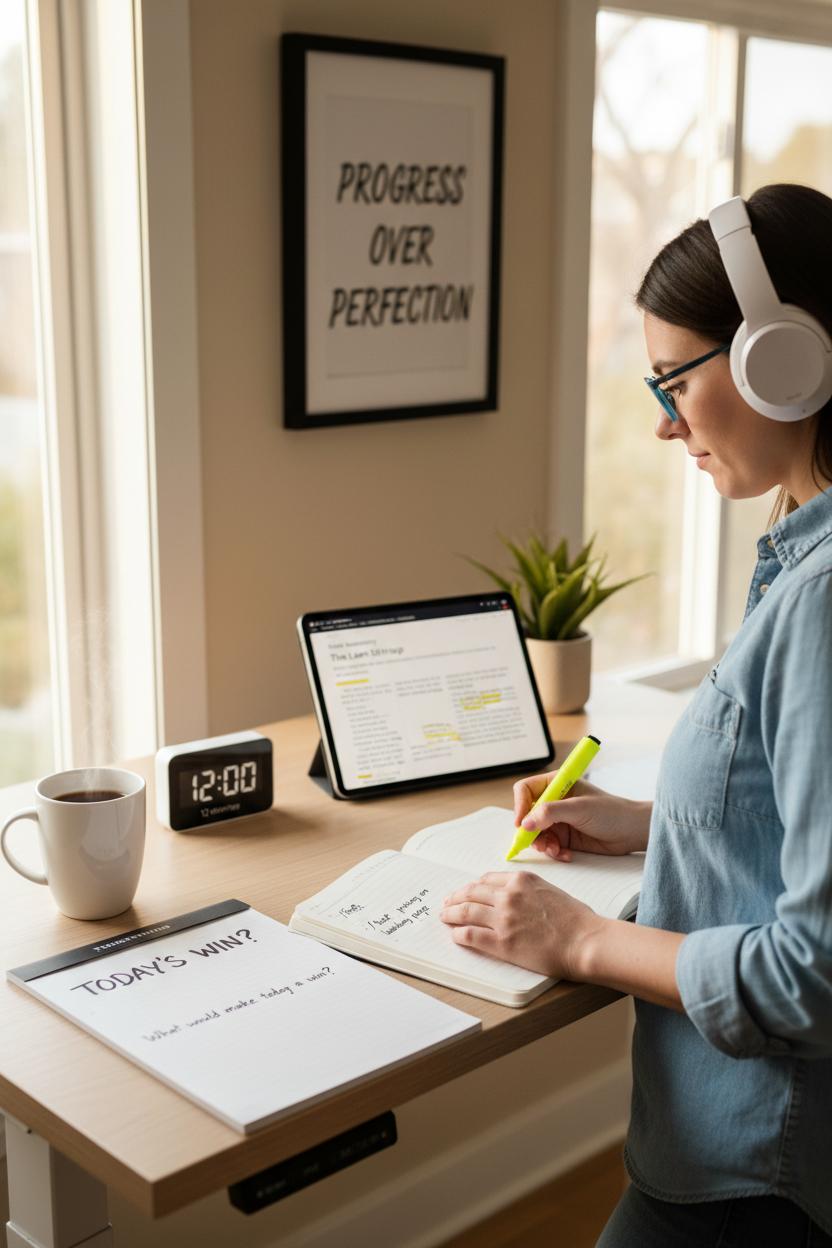 Keep the environment as friction-free as possible. If you’re screen-reading, put on blue light glasses and nudge brightness down. If your home is noisy, slip into noise cancelling headphones and play a low-focus playlist. Try standing for energy at a simple standing desk while you skim, and jot your one takeaway in the margin of your productivity planner so it doesn’t evaporate when Slack starts pinging. I love a bit of motivational wall art by the desk—something that whispers “progress over perfection.” The magic is the constraint: when the timer ends, you stop. Capture the idea, write the first next step, and move. These quick sprints evolve into foundational productivity habits that keep you learning without slipping into procrastination-by-research.