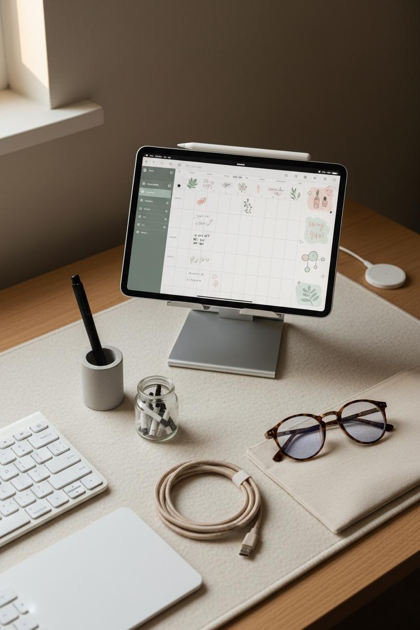 Think of your desk as a tiny set where your products play the lead. To nail that digital products aesthetic, start by curating a minimal workspace with a soft, cohesive palette—oat, stone, and charcoal always photograph beautifully. Layer in textures sparingly: an aesthetic desk mat as the foundation, a smooth ceramic mug, maybe a sprig of eucalyptus for life. Elevate your tablet on a simple tablet stand so the screen sits clean and glare-free, and place a stylus pen diagonally to guide the eye. A slim bluetooth keyboard whispers “workflow,” while a pair of blue light glasses adds a lived-in, creator vibe without clutter. If you sell planners or templates, open one of your digital planner ideas on-screen; show a to‑do list half‑checked or a monthly view mid-edit so shoppers immediately imagine using it. Keep cables tucked, wipe fingerprints, and leave generous negative space where your Etsy thumbnails might need text overlays.