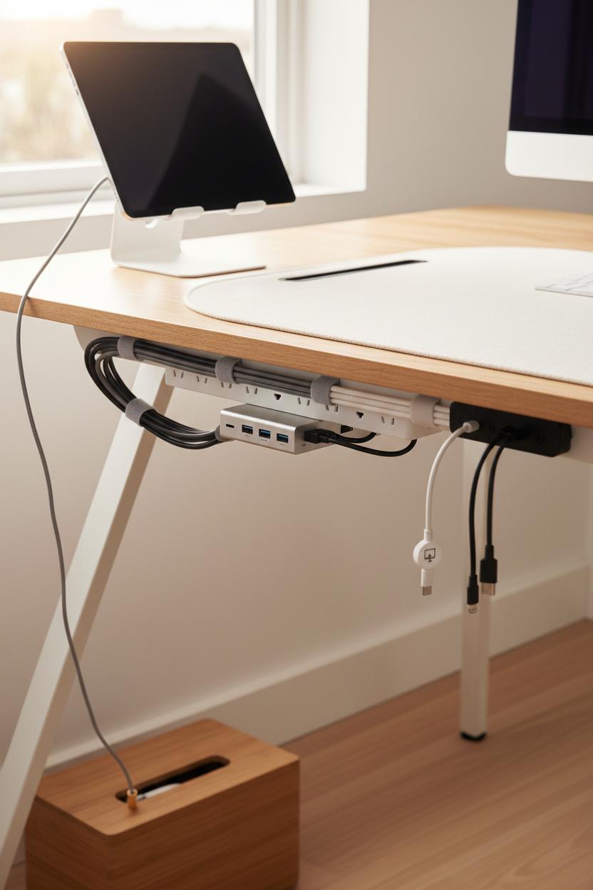 Cables can be the quickest way to dull the glow of a digital products aesthetic, but they don’t have to be the villain. Start by giving every cord a destination: mount a slim power strip beneath the desk and guide lines through adhesive raceways that match your wall or table leg. I bundle by purpose with soft Velcro ties—charging, audio, display—then add tiny washi tags so setup and teardown are almost meditative. A magnetic catch at the desk edge keeps the most-used leads within reach, while a compact USB‑C hub hides underneath, so the surface stays open and calm. If your creator desk setup includes a tablet stand, thread its charging cable down the back and tuck the excess into a small cable box; park a stylus pen in a magnetic holder so it’s always right where your hand lands. Wireless where you can, wired where it counts—that balance keeps a minimal workspace looking clean without sacrificing speed.