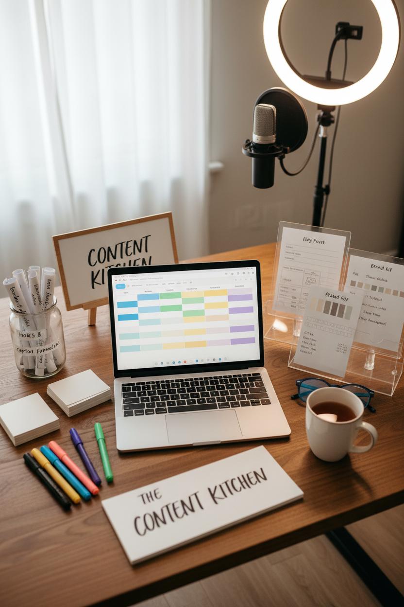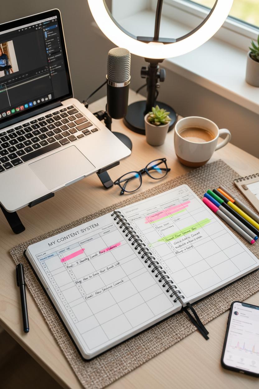 Set up your planner with simple columns you’ll actually use: Pillar, Topic, Keyword, Hook/Angle, Format, CTA, Funnel Stage, Repurpose Route, Due Date, Status. Color-code by platform so batching feels visual and fun; in one glance, you’ll see if you’re too heavy on reels and light on emails. With your hooks ready, you can batch-plan a week of content creation in minutes—drop in a carousel template, outline a quick blog, script a 30-second reel, and cue an email teaser. Keep your setup cozy and efficient: a ring light for crisp video, a USB microphone for clean audio, a laptop stand to lift your screen, and blue light glasses for those late editing sessions. Tiny upgrades smooth the process so your content marketing rhythm feels sustainable, not chaotic.