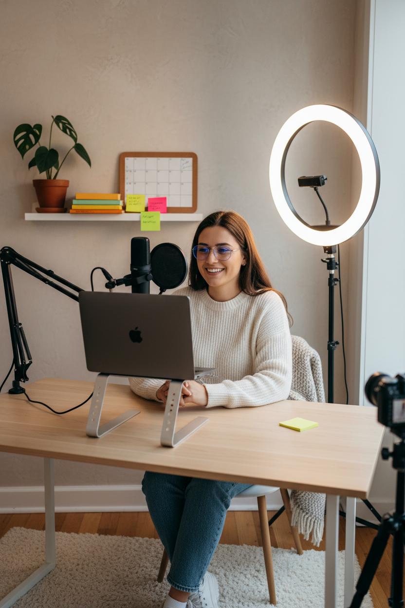 Comfort equals clarity, and the way you set up your space will show up in every frame of your digital content. Lift your camera to eye level with a slim laptop stand so the lens meets you where you are—no more chin-first angles. Keep your eyes on the actual lens (a tiny sticker near it works wonders), and place your notes just beside it for a natural glance. Frame yourself using the rule of thirds with a fingertip of headroom, sit an arm’s length from the camera, and angle a soft ring light at 10 or 2 o’clock to kiss your face without flattening it. Let natural light do the heavy lifting and use the ring light only to fill, not overpower. Tidy the background, add one styled detail (a plant, a stack of books), and bring the mic close: a simple USB microphone just out of frame gives you crisp, cozy audio that feels personal.