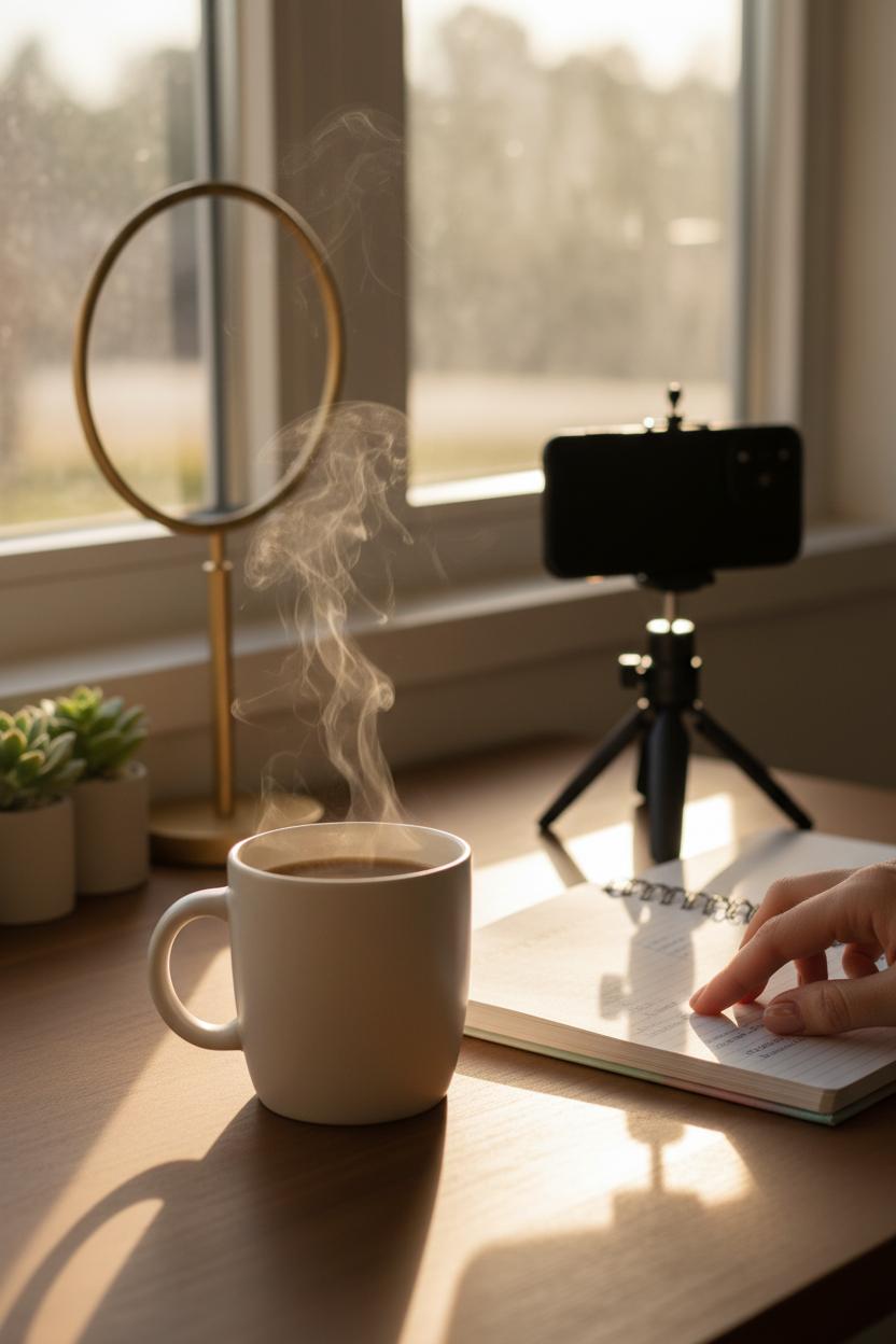 Invite your audience into your world with a gentle, cozy day-in-the-life reel that feels like morning light on your desk and the first swirl of cream in your coffee. Start with a soft, 2-second hook—steam rising from your mug or your hand flipping open a content planner notebook—then glide into the little rituals that make your business yours: lighting a candle, checking your desk whiteboard calendar dotted with pastel highlighters, and tapping through overnight messages. Show your space styled but real: a tidy corner with a ring light and smartphone tripod set up, a stack of orders waiting, your favorite playlist humming. This is one of those digital marketing content ideas that lands because it’s human; it lets followers see the heartbeat behind your logo.