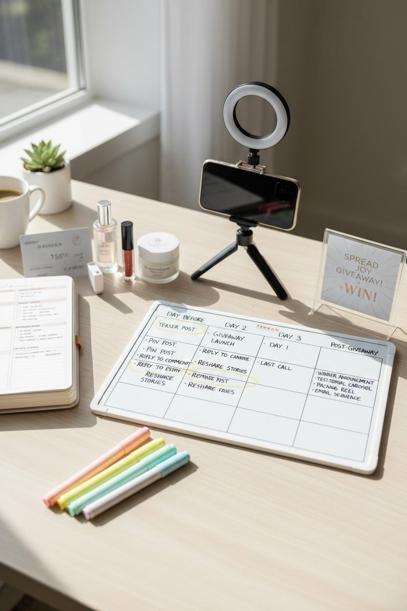 Plan it like a mini-campaign. Open your content planner notebook and map a three-day arc on your desk whiteboard calendar: a teaser the day before, the main giveaway post on day one, a reminder on day two, and a last-call on day three. Highlight key tasks with pastel highlighters so nothing slips—pin the post, reply to every comment, and reshare entrants’ Stories. If you’re partnering with a complementary brand, make it a collab post to tap both audiences. Keep it compliant with a short disclaimer (not affiliated with the platform, no purchase necessary, eligibility details), and wrap with a cheerful winner announcement that tags the winner and thanks everyone who played along. For small business marketing, this is gold: you’ll see a lift in saves, shares, and follows, plus conversation starters right in your comments.