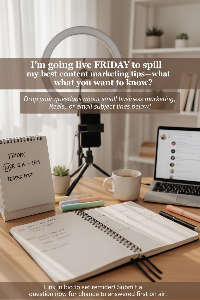 Make it feel polished but low-pressure. Grab your content planner notebook and sketch a quick outline of talking points, then color-code your segments with pastel highlighters so you can glance and go. Add the date to your desk whiteboard calendar, and block a reminder to follow up with a teaser 24 hours before you go live. If you’re filming, a ring light and a smartphone tripod instantly elevate your video without any fancy setup—position near a window, test your mic, and choose a clean backdrop. Share the signup or “set reminder” link in your bio and Stories, and nudge your audience: “Submit a question now for a chance to be answered first on air.” During the session, invite viewers to drop emojis to vote on topics, and close by teasing the replay and the next live date. Afterward, repurpose the best answers into bite-sized posts for your content calendar—quote cards, a quick reel, or a carousel of FAQs—so that one event fuels a week of social media content. Bonus points if you compile the top questions into a blog or newsletter roundup titled “Your Questions, Answered,” giving you even more digital marketing content ideas to pull from whenever you need them.