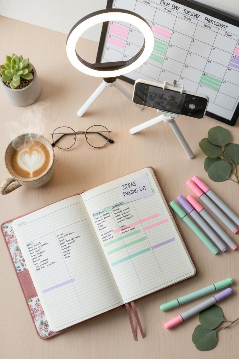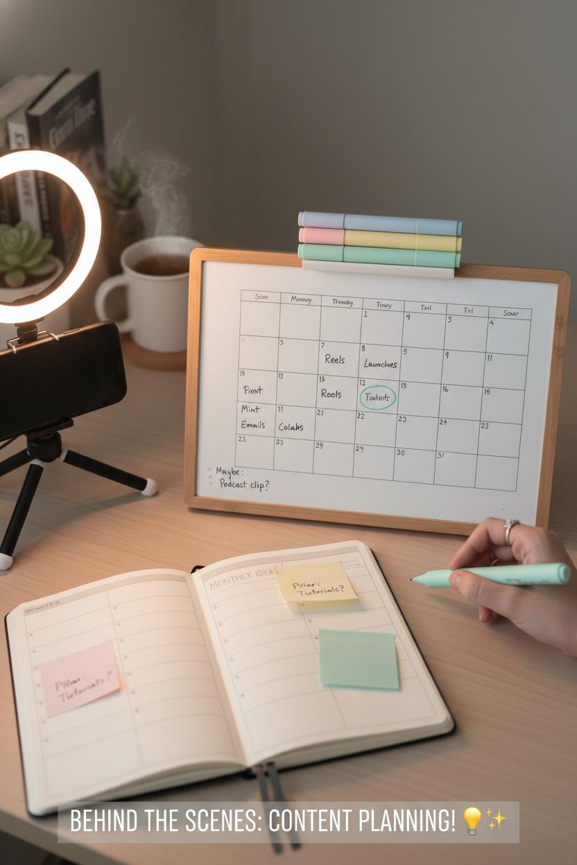 Invite your audience into the cozy, real-life magic of your workspace and show them how you set up a simple shoot with nothing more than a ring light and a trusty smartphone tripod. This kind of behind-the-scenes peek is one of those digital marketing content ideas you can post today without overthinking—just warm lighting, a clean corner, and you doing your thing. Start with a tidy flat lay: your content planner notebook open to today’s goals, a few pastel highlighters scattered artfully, and your desk whiteboard calendar in the background to hint at your content calendar rhythm. The visual says, “I’m organized, I’m approachable, and I’m getting things done,” which is exactly the vibe that draws people into your social media content.