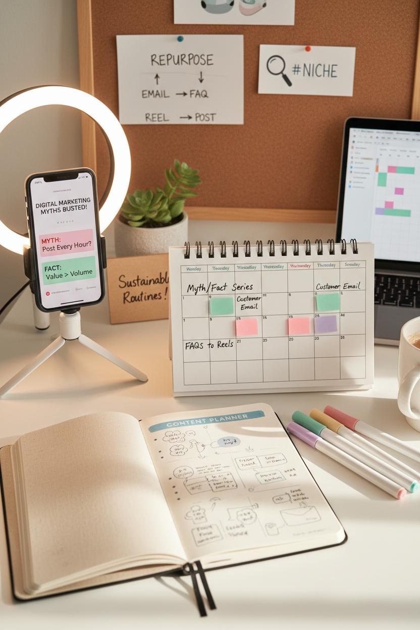 Another common myth: you need to be on every platform. Fact: you need to be where your people are. Pick one or two channels you can love consistently and go deep. Myth: hashtags are “over.” Fact: well-chosen, niche tags still help discovery, especially when paired with clear captions. Myth: long captions don’t work. Fact: storytelling builds trust—share the why behind your offer and watch your saves climb. Tuck these content marketing tips into your routine: repurpose a customer email into a post, turn FAQs into reels, and schedule reminder posts ahead of launches. Your content calendar becomes a safety net, not a stressor, when your ideas are parked where you’ll see them.