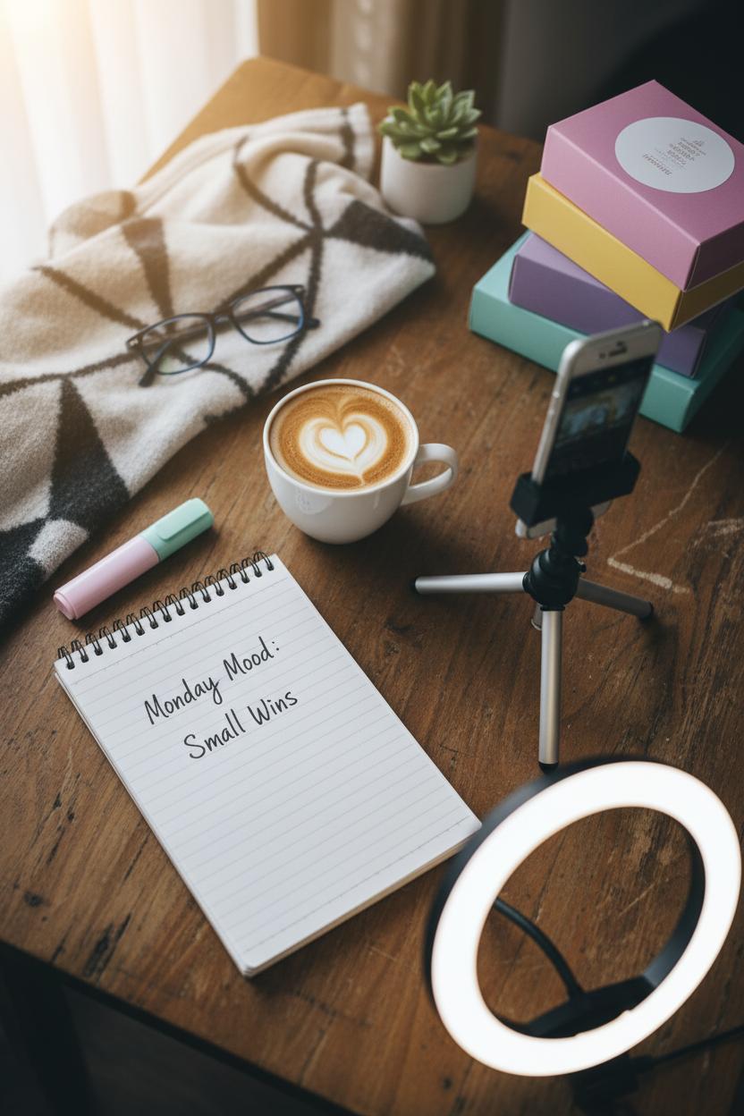 Need something you can post before your coffee cools? Grab your phone, pop it on a smartphone tripod, flick on a ring light if the window isn’t doing its job, and film a 10-second behind-the-scenes moment: the first order of the day getting packed, the latte fueling your brainstorm, the messy-to-magic swipe of tidying your display, or a quick pan over today’s to-do list. These digital marketing content ideas thrive on immediacy and personality, so keep it candid and warm, then add a cozy caption like “Monday mood, small wins edition” and a simple call to action. If video feels big, snap a flat-lay of your workspace, share a quote you love, or post a product-of-the-day shot—this kind of social media content doesn’t need perfection, it needs presence, and your audience will feel the heartbeat of your brand in the little things.